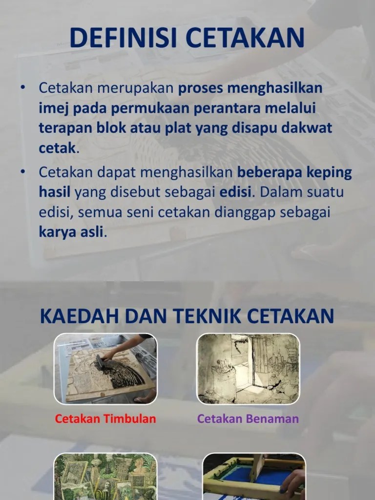 Screen print @ silkscreen printing dikenali sebagai teknik sutera saring . Cetakan stensil @ sutera saring. Merupakan satu teknik cetakan yang menggunakan stensil diatas skrin atau saring yang diperbuat daripada kain sutera. Cetak saring merupakan teknik cetakan yang menggunakan jaringan beranyam bagi. Karya seni cetak dilakarkan di atas permukaan yang disebut dengan plat. Pengenalan cetakandi malaysia cetakan dihasilkan dengan menggunakan pelbagai teknik dan media. I) kaedah potongan kertas pendua . Terdapat tiga kaedah yang boleh digunakan didalam penghasilan cetakan stensil iaitu: Antara berikut pilih bahan yang sesuai digunakan bagi cetakan kaedah timbulan. Cetakan ini menggunakan pelbagai teknik seperti emulsi foto dan potongan kertas atau filem. 7,482 views aug 1, 2020 video menunjukkan hasil cetakan stensil menggunakan teknik /kaedah cetakan sutera saring oleh pelajar sekolah . Teknik dengan menggunakan kaedah digital menjadi semakin popular saat . • dakwat diterapkan melalui ruang stensil yang . Cetakan stensil menggunakan teknik cetakan sutera saring (silk screen printmaking).